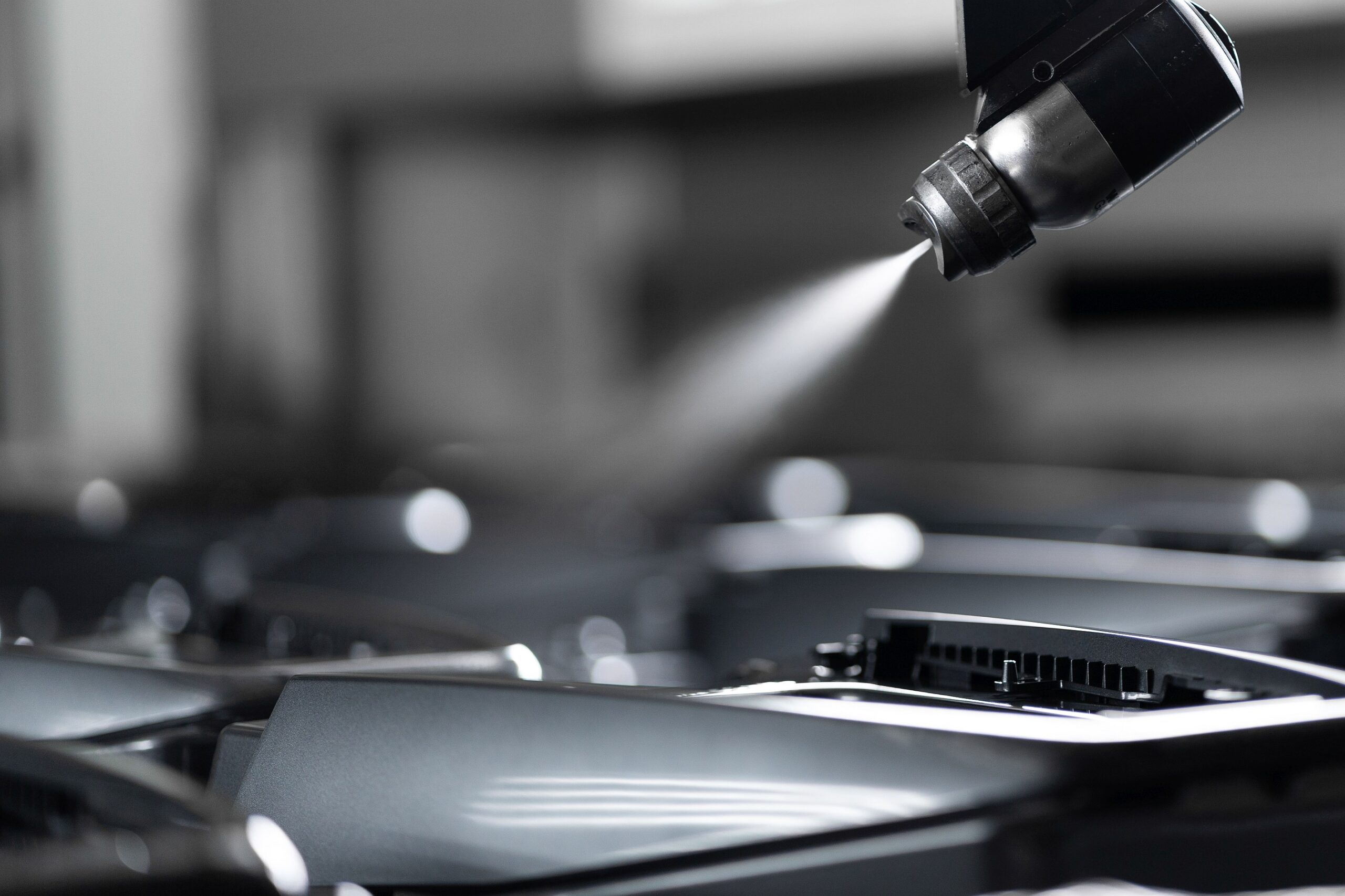 The parts are coated in paint shops from Venjakob Maschinenbau GmbH, which feature integrated CO2 snow-jet cleaning systems. “It is essential that surfaces are absolutely clean, especially if parts are to be painted with a high-gloss piano black finish. The tiniest dust particles or fibers are enough to cause surface irregularities and thus rejects,” explains David Heidrich, Head of Paint Shop at KTX in Weissenburg. “We are therefore always interested in solutions that allow us to further optimize our processes.” One such opportunity presented itself when the head of department met a former colleague from technical school. He was now working as an application engineer at acp systems AG, a global technology leader with its quattroClean snow-jet technology. The technology uses liquid, recycled carbon dioxide as a cleaning medium, which is guided through a wear-free, two-substance ring nozzle. The carbon dioxide expands on exiting the nozzle to form fine CO2 snow, which is then bundled by a separate jacket jet of compressed air and accelerated to supersonic speed. On impacting on the surface to be cleaned, the jet of snow and compressed air develops a combination of thermal, mechanical, solvent and sublimation effects. The interaction of these four mechanisms of action remove particulate contamination right down to the submicrometer range and also filmic contamination reliably and reproducibly. Since the crystalline carbon dioxide sublimates completely during the process, the cleaned surfaces are dry and free of residues.